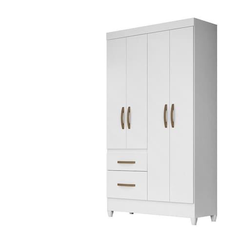 Guarda roupas solteiro Madri 4 portas com 2 gavetas, corrediças metálicas, interna com prateleiras e bastão cabideiro, espaço para acomodar sapatos, pés em PVC, puxadores plásticos na cor bronze, impressão UV.