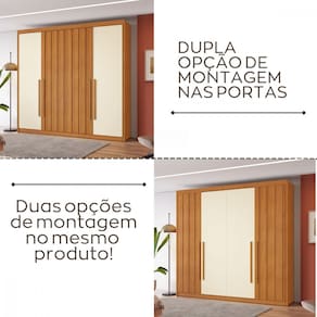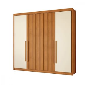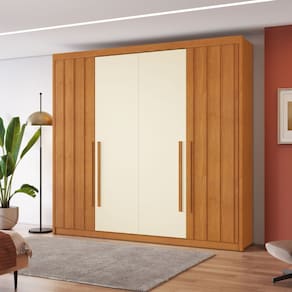 Características: - Estrutura em MDF de 12,15,25 mm - Puxadores em madeira - 04 Gavetas internas com corrediças telescópicas - 02 Portas ripadas e 02 portas lisas - Cabideiros em alumínio - Acabamento/Pintura: Semi-Brilho - Sem pés - Suporte de peso das prateleiras: 10 kg - Suporte de peso das gavetas: 5 kg - Suporte de peso dos cabideiros: 7 kg - Garantia de 3 meses