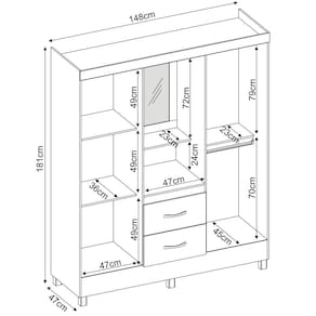 Largura: 148 cmAltura: 181 cmProfundidade: 47 cmPeso: 67,50 KilosGarantia: 03 MesesInformações: Não possuímos serviço de montagem. Todos os móveis possuem garantia e manual de montagem, Não nos responsabilizamos pelos custos de montagem. É de extrema importância ficar atento às dimensões dos produtos, pois é de sua total responsabilidade caso o produto tenha dimensões superiores ao local de acesso da entrega dificultando ou impossibilitando que a mesma seja concluída. Não nos responsabilizamos, no ato da entrega, por subir escadas, corredores e elevadores ou transporte por guincho em apartamentos. Não nos responsabilizamos por transtornos com a entrega caso o produto necessite de desmontagem, nem pelos custos gerados por esta situação. Imagens meramente ilustrativas a cor, pode variar de acordo com a iluminação do ambiente. Itens de decoração não inclusos.