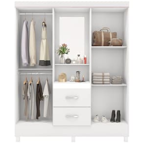 Estrutura: MDPAcabamento: Pintura U.V, de alto padrãoPorta: Sim, 04 portas de abrir com dobradiças metálicasGaveta: Sim, 02 gavetas com corrediças metálicas, que suportam ate 4 kilosPrateleira: Sim, 03 prateleiras internas, suporta até 3 kilosEspelho: Sim, na parte central com tamanho de 62 cm x 37 cm x 0,3 cmCalceiro/Cabideiro: Sim, em metal Pés: Sim, em PVC maior durabilidade, acompanha 6 unidadesPuxador: Sim, na coloração cromadoDimensões do produto montado