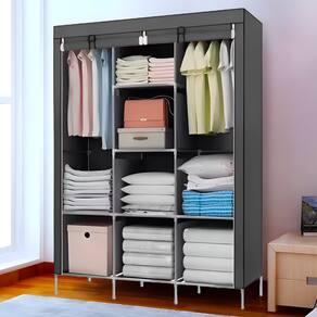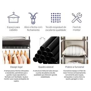 Armário prático de tecido dobrável com três divisões verticais, possui dois grandes espaços com cabideiro e 8 prateleiras. Possui cortina de rolo e abre e fecha com fechamento. Ele é projetado em tecido respirável de excelente qualidade e muito fácil de limpar. Também é fácil de montar. Uma opção útil e prática para manter suas roupas organizadas.