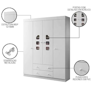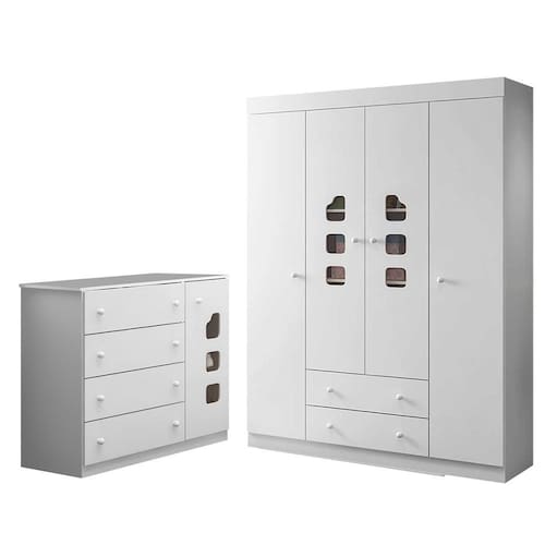 Composto por um guarda roupa e uma cômoda, todos feitos 100% MDF que garante a qualidade e durabilidade aos móveis, e pintura atóxica que não agride a saúde do bebê. O Guarda Roupa Infantil é um móvel espaçoso e charmoso, que tem quatro portas com detalhes em acrílico e puxadores redondos, que dão um toque de elegância ao ambiente. Ele tem um espaço interno incrível, com divisórias, prateleiras, cabideiro e gavetas, que permitem organizar as roupas e os objetos do seu bebê de forma prática e eficiente. Ele também tem portas com dobradiças metálicas, que abrem e fecham com facilidade e sem ruídos. A Cômoda Infantil é um móvel delicado e funcional, que tem uma porta e quatro gavetas com corrediças telescópicas, que facilitam a abertura e o fechamento das gavetas. A cômoda também tem detalhes em acrílico nas portas e puxadores redondos em PVC, que combinam com o guarda roupa. Ela conta com um cabideiro, para você pendurar as peças mais delicadas do seu bebê. A cômoda tem um acabamento em pintura UV, que garante a durabilidade do produto. Sem dúvida o conjunto ideal para o Quarto Do Bebê!