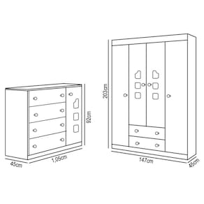 Composto por um guarda roupa e uma cômoda, todos feitos 100% MDF que garante a qualidade e durabilidade aos móveis, e pintura atóxica que não agride a saúde do bebê. O Guarda Roupa Infantil é um móvel espaçoso e charmoso, que tem quatro portas com detalhes em acrílico e puxadores redondos, que dão um toque de elegância ao ambiente. Ele tem um espaço interno incrível, com divisórias, prateleiras, cabideiro e gavetas, que permitem organizar as roupas e os objetos do seu bebê de forma prática e eficiente. Ele também tem portas com dobradiças metálicas, que abrem e fecham com facilidade e sem ruídos. A Cômoda Infantil é um móvel delicado e funcional, que tem uma porta e quatro gavetas com corrediças telescópicas, que facilitam a abertura e o fechamento das gavetas. A cômoda também tem detalhes em acrílico nas portas e puxadores redondos em PVC, que combinam com o guarda roupa. Ela conta com um cabideiro, para você pendurar as peças mais delicadas do seu bebê. A cômoda tem um acabamento em pintura UV, que garante a durabilidade do produto. Sem dúvida o conjunto ideal para o Quarto Do Bebê!