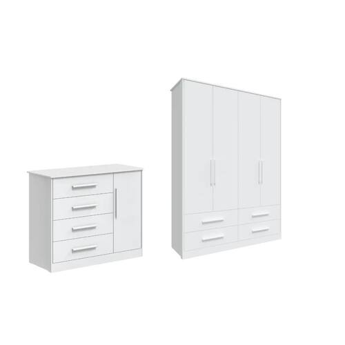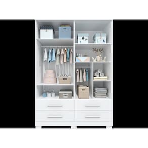 O Armário Charlô 4 Portas é um produto 100% MDF e possui pintura atóxica. Seu caixote é em chapa de 12 mm, enquanto as frentes e as molduras são em chapa de 15 mm de espessura. Seus pés são injetados em plástico de alta resistência. Os puxadores são fabricados em MDF revestido com papel melamínico. Possui cabideiro metálico, gavetas com corrediças telescópicas e portas