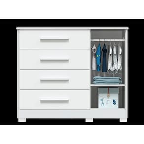 A Cômoda Charlô 1 Porta é um produto 100% MDF e possui pintura atóxica. Seu caixote é em chapa de 12 mm, enquanto o tampo superior, as frentes e as molduras são em chapa de 15 mm de espessura. Seus pés são injetados em plástico de alta resistência. Os puxadores são fabricados em MDF revestido com papel melamínico. Possui cabideiro metálico, gavetas com corrediças telescópicas e porta .
