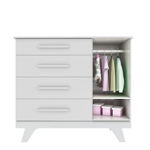 Tampo com Bordas Laqueadas; Cabideiro aluminio; 04 Gavetas com corrediças telescópicas; Puxadores em MDF revestido;