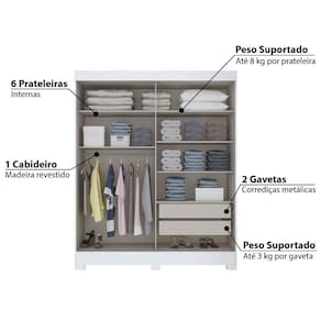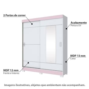 Características: - Branco/Branco/Rosa Chá II - Estrutura: Caixa MDP 15mm Interno MDP 12mm - Frente MDP 12mm Fundo MDF 3mm. - Acabamento: Pintura UV - 2 Portas de Correr - 1 Cabideiro de Madeira revestido - 2 Maleiro - 6 Prateleiras internas - 2 Gavetas - Corrediças Metálicas - Puxador em ABS - Montagem flex durante o processo de montagem o cliente escolha entre 2 opções de cores. - Espelho de 1250 x 350mm - Acompanha pés, pode ser montado sem - Peso suportado por gavetas: 3 kg - Peso suportado por prateleira: 8 kg - Peso suportado: 62 kg - Marca: Henn