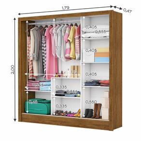 combinado com 6 prateleiras e 1 cabideiro, além de deixar o produto lindo e funcional, proporciona ao cliente acomodar suas roupas de forma organizada. As roldanas em aço e o trilho em alumínio potencializam o deslizar das portas. Cabideiro com 1,11m em alumínio. Ideal para pendurar pares de blusas, camisas, vestidos, acessórios, entre outros. As pratileiras é o lugar o ideal para colocar roupas de cama e de banho, perfumes, kits de maquiagem, caixinhas com acesórios e bolsas menores. As sapateiras tem o espaço ideal para guardar desde mala de viagem, até coleções de sapatos, tênis, ou outros acessórios.