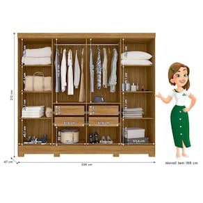 O Guarda-Roupa Diplomata se destaca por sua amplitude e divisões bem planejadas, incluindo uma partição ele/ela que facilita a organização. Com 8 portas e 4 gavetas, oferece bastante espaço interno para armazenamento. Os puxadores em MDF proporcionam durabilidade e um toque estético, enquanto as corrediças metálicas garantem suavidade ao abrir e fechar as gavetas. Os pés em PVC contribuem para a estabilidade do móvel e protegem o piso contra danos. Essas características fazem do Guarda-roupa Diplomata uma escolha funcional e prática para qualquer ambiente.