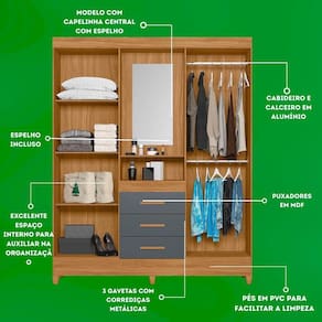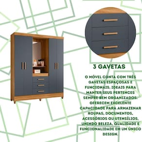 Guarda Roupa Grande Quarto Capri 4 Portas 3 Gavetas Espelho Freijo Com Cinza Com design moderno e estrutura funcional, o Guarda-Roupa Capri é perfeito para quem busca praticidade e estilo em um único móvel. Seu formato com 4 portas de giro e 3 gavetas oferece amplo espaço para roupas, calçados e acessórios, garantindo organização e conforto no dia a dia.O modelo faz parte da linha Smart, combinando elegância e durabilidade. As gavetas com corrediças metálicas proporcionam deslizamento suave, enquanto os cabideiros e calceiros em alumínio garantem resistência. Os puxadores em MDF e os pés em PVC completam o conjunto, oferecendo acabamento refinado e facilidade de limpeza.Dimensões:Altura: 204 cmLargura: 165 cmProfundidade: 47 cmDiferenciais:- 4 portas de giro com ótimo aproveitamento interno- 3 gavetas amplas com corrediças metálicas resistentes- Cabideiro e calceiro em alumínio para melhor organização- Puxadores em MDF, com toque moderno e ergonômico- Pés em PVC que facilitam a limpeza e protegem o móvel da umidade- Estrutura robusta e compacta, ideal para diversos tipos de quarto- Design da linha Smart, unindo praticidade e elegância Marca: Não Informado