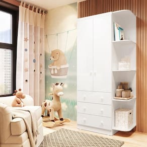 O produto foi desenvolvido para oferecer qualidade, beleza, conforto e seguran?a para toda fam?lia na hora de montar o quarto do beb?. O Guarda Roupas Smim ? produzido com uma estrutura de 100 MDF e acabamento revestido com pintura UV at?xica. As portas de bater possuem dobradi?as met?licas e gavetas com corredi?as met?licas telesc?picas que permitem um deslize suave e silencioso, com puxadores pontuais de pl?stico. Acompanha prateleiras externas no estilo cantoneira para fixa??o ao m?vel e dois modelos de rodap?s que podem ser escolhidos na hora de montar. Uma ?tima solu??o para espa?os reduzidos. ? um produto pr?tico e indispens?vel. Adquira o seu j?!
