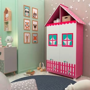 A linha Casinha cresceu e agora traz em sua composição o Roupeiro Casinha 2 portas, este produto agrega beleza e funcionalidade, com design exclusivo consegue atender a um publico exigente. O Roupeiro Casinha tem amplo espaço interno, 2 tubos cabideiros em alumínio, 2 gavetas com corrediças metálicas, espaço para vestidos e prateleiras e colmeias organizadoras, seu charme especial fica a cargo de sua aparência de casinha trazendo um ambiente lúdico e magico para o produto.