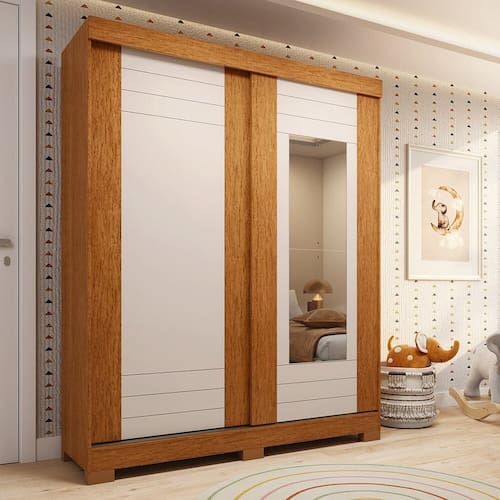 Que tal redecorar seu quarto com muito estilo e qualidade? O Guarda Roupa Lunara é perfeito para essa proposta. Desenvolvido em 100% MDF, Pintura UV e com detalhes a laser nas portas, oferece ao ambiente todo charme das tendências atuais de decoração e a garantia de maior resistência. Também conta com divisões bem distribuídas em seu interno, com 3 prateleiras e 2 gavetas de corrediças telescópicas. Seu cabideiro e o trilho inferior são em alumínio. Aproveite e adquira já o seu! Acabamento da Prateleira: Pintura UV Escala de Brilho da Prateleira: Semi-Brilho Acabamento da Gaveta: Pintura UV Escala de Brilho da Gaveta: Semi-Brilho Possui Organizador de Gaveta: Não Acabamento da Porta: Pintura UV Escala de Brilho da Porta: Semi-Brilho Acabamento dos Pés: Pintura Altura do Espelho: 120 cm Altura dos Pés: 5 cm Altura Máxima dos Pés: 5.0000 codigo_ean: 7900288191519 Complexidade da Montagem: Alta: deve ser montado por um montador especializado Cor: Cinamomo/Off White Cor da Porta: Off White Cor do Produto: Cinamomo/Off White Cor Flex: Sim Cor Interna: Off White Escala de Brilho: Semi-Brilho Espessura do Espelho: 3 mm Formato do Espelho: Retangular Gaveta com Chave: Não Guarda-Roupa Suporta Até (kg): 60 kg Itens Inclusos: 1 Guarda-Roupa, Kit Ferragens e Manual de Montagem Largura do Espelho: 70 cm Linha ou Coleção: Lunara Manual de Montagem e Instalação: https://product-hub-prd.madeiramadeira.com.br/215413720/documents/1fa1cc2c-c3d2-4ab5-8f6f-fb5e6e0766823056776453317519923801768.pdf Marca: Espresso Móveis Material da Gaveta: MDF Material da Porta: MDF Material da Prateleira: MDF Material dos Pés: ABS Material Principal: MDF modular: Não Montagem Flex: Não Necessita Montagem: Sim Nicho com Cabideiro: Não Origem do Produto: Nacional Peso: 82,5 kg Peso Máximo por Gaveta: 5 kg Peso Máximo por Prateleira: 5 kg Porta Janelada: Não Possui Calceiros: Não Possui Capelinha: Não Possui Ganchos: Não Possui Nichos: Não Possui Penteadeira: Não Possui Pés: 06 Possui Portas: Sim Possui Prateleiras: Sim Produto Montado: Sim Quantidade de Cabideiros: 01 Cabideiro Quantidade de Espelho: 02 Espelhos com Tamanhos Iguais Quantidade de Gavetas: 02 Gavetas Quantidade de Prateleiras: 03 Prateleiras Recomendações de Uso, Manutenção e Limpeza: Para limpar não use nenhum tipo de produto, tais como sabão, esponja de aço, álcool e lustra-móveis. Use somente uma flanela seca. Não molhe nem exponha o móvel à umidade ou a luz solar diretamente ou outra forma de calor. Não encoste o móvel na parede. Não o arreste. Se precisar mudar o móvel de lugar, esvazie por completo o móvel, não o arraste, com ajuda de outras pessoas suspenda o móvel de forma segura e o posicione no lugar desejado. Sapatas Niveladoras: Não Sistema de Montagem: Parafusos, Minifix e Cavilhas Suporta Até (kg): 60 kg Tipo de Corrediça da Gaveta: Metálica Telescópica Tipo de Dobradiça/Corrediça da Porta: Alumínio Tipo de Fixação do Espelho: Parafusos Tipo de Gaveta: Interna Tipo de Guarda-Roupa: Infantil Tipo de Puxador da Porta: Não Possui