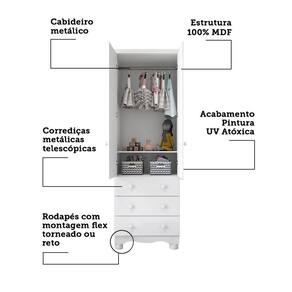 É produzido com estrutura em 100% MDF e acabamento em pintura UV atóxica. Possui 2 portas, 3 gavetas que deslizam sob corrediças metálicas telecópicas, 1 cabideiro metálico, 1 prateleira para acomodar as peças com organização da sua preferência, puxadores e pés em plástico. Acompanham o produto, 2 opções de rodapés, um usinado (torneado) e outro reto, para que você escolha no momento da montagem qual se adequa ao estilo do ambiente. Aproveite para adquirir o seu agora! Acabamento da Prateleira: Pintura UV Escala de Brilho da Prateleira: Semi-Brilho Possui Cabideiros: Sim Acabamento da Gaveta: Pintura UV Escala de Brilho da Gaveta: Brilhante Possui Organizador de Gaveta: Não Acabamento da Porta: Pintura UV Escala de Brilho da Porta: Brilhante Material do Puxador da Porta: Plástico Ambiente Principal: Quarto Infantil codigo_ean: 7908709400691 Complexidade da Montagem: Média: pode ser montado por mais de uma pessoa e/ou necessite de maior conhecimento para montagem Cor: Branco Brilho Cor do Produto: Branco Brilho Cor Interna: Branco Escala de Brilho: Brilhante Gaveta com Chave: Não Guarda-Roupa Suporta Até (kg): 30 kg Informações Complementares: • Estrutura MDF 12mm. Fundo em HDF 2,5mm. • Pintura atóxica. • 1 cabideiro metálico. Itens Inclusos: 1 Guarda Roupa, 1 Kit Ferragens e 1 Manual de Montagem Linha ou Coleção: Mimo Manual de Montagem e Instalação: https://product-hub-prd.madeiramadeira.com.br/876355/documents/45fdcc3c-c943-4b9d-876a-0e38594155b6riojunuli02ptnewv125052023.pdf Material da Gaveta: MDF Material da Porta: MDF Material da Prateleira: MDF Material Principal: MDF modular: Não Montagem Flex: Sim, pode ser montado com rodapé retrô ou usinado/torneado. Necessita Montagem: Sim Origem do Produto: Nacional Peso: 38,35 kg Peso Máximo por Gaveta: 4 kg Peso Máximo por Prateleira: 5 kg Possui Calceiros: Não Possui Espelho: Não Possui Nichos: Não Possui Pés: Não Possui Portas: Sim Possui Prateleiras: Sim Produto Montado: Sim Quantidade de Gavetas: 03 Gavetas Quantidade de Prateleiras: 01 Prateleira Recomendações de Uso, Manutenção e Limpeza: Para limpeza utilizar somente pano limpo e macio, ligeiramente umedecido em água (apenas o bastante para remover a poeira), seguido de um pano seco. Sapatas Niveladoras: Sim Sistema de Montagem: Parafusos Autoatarraxantes, Conjuntos Minifix, Cavilhas de Madeira, Acessórios Plásticos e Metálicos Suporta Até (kg): 30 kg Tipo de Corrediça da Gaveta: Metálica Telescópica Tipo de Dobradiça/Corrediça da Porta: Metálica Tipo de Gaveta: Externa Tipo de Guarda-Roupa: Bebê Tipo de Puxador da Porta: Externo Ean: 7908709400691