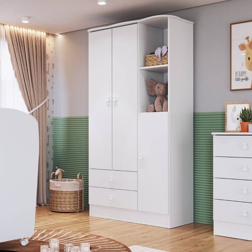 Guarda Roupa Infantil 3 Portas 2 gavetas Tedy Percasa O Guarda-Roupa 3 Portas e a opcao perfeita para quem busca funcionalidade, resistencia e um toque delicado na decoracao do quarto do bebe. Produzido em MDP BP, o movel oferece durabilidade e acabamento de alta qualidade, garantindo beleza no dia a dia. Conta com nichos abertos, ideais para acomodar itens decorativos ou de uso frequente, deixando tudo sempre a mao. Suas gavetas possuem corredicas telescopicas, que proporcionam abertura suave e total, enquanto as dobradicas metalicas garantem firmeza e longa vida util as portas. O destaque fica por conta do puxador em formato de urso, que adiciona um charme especial e combina perfeitamente com o ambiente infantil.