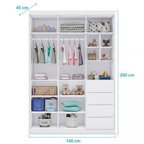 Guarda-Roupa Infantil Eloá oferece funcionalidade e estilo com 3 portas e 4 gavetas espaçosas. Feito em MDF com acabamento em pintura UV atóxica e acetinada, conta com puxadores em cava e gavetas com corrediça telescópica. Ideal para organização e decoração do quarto infantil.