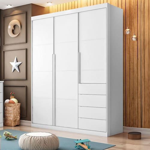 O Guarda-Roupa Infantil Pérola oferece 3 portas e 4 gavetas, ideal para organizar o quarto das crianças. Feito em MDF com acabamento semi-brilho, é durável e fácil de limpar. Possui gavetas com corrediça telescópica e portas articuladas de metal. Design prático e moderno para um ambiente mais funcional.