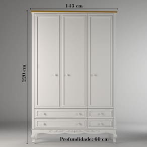 Móveis clássicos, trazendo o estilo provençal com muita sofisticação. Com design charmoso e arabescos entalhados, os móveis da linha Versailles deixam o quarto digno da realeza. O guarda-roupa Versailles possui uma estrutura robusta e durável, pois utiliza em sua fabricação madeira maciça e MDF de 2,5cm de espessura. A sua base é reforçada, elevando o aspecto clássico e dando maior durabilidade. O acabamento de alto padrão traz: pintura laca, detalhes em alto relevo e arabescos entalhados. Puxadores de madeira maciça. Possui corrediças telescópicas largas, de alta resistência nas gavetas. E dobradiças soft close nas portas, com fechamento com amortecimento. Tem amplo espaço interno, com 5 prateleiras e 1 cabideiro. Disponível nas versões 1,40mt e 1,60mt. Acabamento da Gaveta: Laca Acabamento da Porta: Laca Acabamento da Prateleira: Melamínico Acabamento dos Pés: Laca Altura dos Pés: 23 Ambiente Principal: Quarto Infantil Complexidade da Montagem: Alta: deve ser montado por um montador especializado Cor: Branco/Mel Cor do Produto: Branco/Mel Cor Flex: Não Cor Interna: Branco Escala de Brilho: Fosco Escala de Brilho da Gaveta: Fosco Escala de Brilho da Porta: Fosco Escala de Brilho da Prateleira: Fosco Gaveta com Chave: Não Guarda-Roupa Suporta Até (kg): 150 Itens Inclusos: 1 Guarda Roupa, Kit Ferragens e Manual de Montagem Linha ou Coleção: Versailles Manual de Montagem e Instalação: https://cdn2.madeiramadeira.com.br/atributo/timber/1261453-manual-roupeiro-versailles-rev00.pdf Material da Gaveta: MDF Material da Porta: MDF Material da Prateleira: MDF Material do Puxador da Porta: Madeira Maciça Material dos Pés: Madeira Maciça Material Principal: MDF Montagem Flex: Não Necessita Montagem: Sim Origem do Produto: Nacional Peso: 165 Peso Máximo por Gaveta: 5 Peso Máximo por Prateleira: 5 Possui Cabideiros: 01 Possui Calceiros: Não Possui Espelho: Não Possui Possui Organizador de Gaveta: Não Possui Pés: 04 Possui Portas: 03 Possui Prateleiras: 05 Recomendações de Uso, Manutenção e Limpeza: Para higienização, utilizar um pano levemente umedecido. Sapatas Niveladoras: Não Sistema de Montagem: Parafusos, Minifix, Cavilhas. Tipo de Corrediça da Gaveta: Metálica Telescópica Tipo de Dobradiça/Corrediça da Porta: Metálica Tipo de Gaveta: Externa Tipo de Guarda-Roupa: Infantil Tipo de Madeira Maciça dos Pés: Pinus Tipo de Puxador da Porta: Externo Marca: Timber