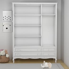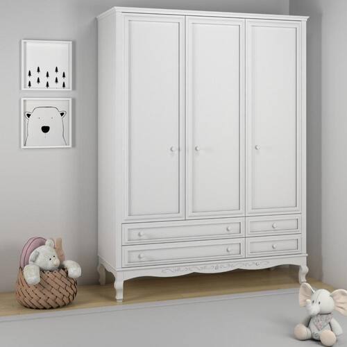 Guarda Roupa Infantil 3 Portas 4 Gavetas Versailles Timber Branco. Móveis clássicos, trazendo o estilo provençal com muita sofisticação. Com design charmoso e arabescos entalhados, os móveis da linha Versailles deixam o quarto digno da realeza. O guarda-roupa Versailles possui uma estrutura robusta e durável, pois utiliza em sua fabricação madeira maciça e MDF de 2,5cm de espessura. A sua base é reforçada, elevando o aspecto clássico e dando maior durabilidade. O acabamento de alto padrão traz: pintura laca, detalhes em alto relevo e arabescos entalhados. Puxadores de madeira maciça. Possui corrediças telescópicas largas, de alta resistência nas gavetas. E dobradiças soft close nas portas, com fechamento com amortecimento. Tem amplo espaço interno, com 5 prateleiras e 1 cabideiro. Disponível nas versões 1,40mt e 1,60mt. Marca: Timber Ean: 7908308793118