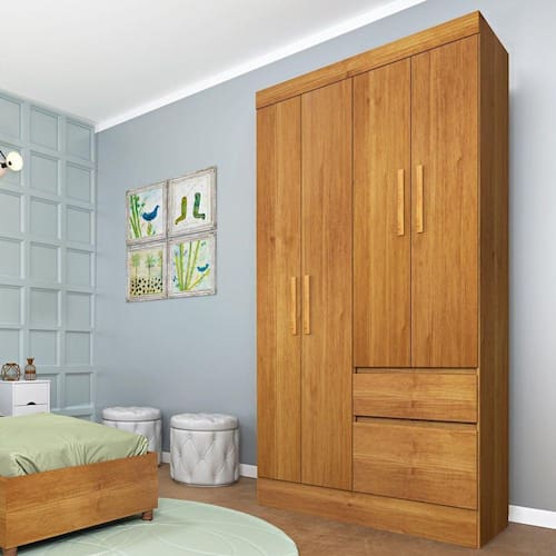 Já imaginou um móvel perfeito para deixar tudo organizado no quarto do seu filho? Com este Guarda Roupa Oregon você não terá mais preocupações com a bagunça! Ele possui espaço para acomodar perfeitamente as suas roupas e acessórios. Não é perfeito? Acabamento da Gaveta: Pintura Acabamento da Porta: Pintura Acabamento da Prateleira: Pintura Ambiente Principal: Quarto Infantil Complexidade da Montagem: Média: pode ser montado por mais de uma pessoa e/ou necessite de maior conhecimento para montagem Cor: Cinamomo Cor do Produto: Cinamomo Escala de Brilho: Semi-Brilho Escala de Brilho da Gaveta: Fosco Escala de Brilho da Porta: Fosco Escala de Brilho da Prateleira: Fosco Gaveta com Chave: Não Itens Inclusos: 1 Guarda Roupa, Kit Ferragens e Manual de Montagem Linha ou Coleção: Oregon Manual de Montagem e Instalação: https://cdn2.madeiramadeira.com.br/atributo/tcil-moveis/514432-esquema-de-montagem-roupeiro-4-portas-oregon.pdf Material da Gaveta: MDP Material da Porta: MDP Material da Prateleira: MDP Material do Puxador da Porta: MDF Material Principal: MDP Necessita Montagem: Sim Origem do Produto: Nacional Peso: 62,4 kg Peso Máximo por Gaveta: 10 kg Possui Cabideiros: 01 Possui Calceiros: Não Possui Espelho: Não Possui Possui Organizador de Gaveta: Não Possui Pés: Não Possui Portas: 04 Possui Prateleiras: 03 Recomendações de Uso, Manutenção e Limpeza: Não colocar o produto em lugar úmido, não arrastar, limpar somente com pano macio e seco, não expor o produto a incidência de luz solar, não colocar peso superior ao indicado. Sapatas Niveladoras: Não Sistema de Montagem: Parafusos e cavilhas Tipo de Corrediça da Gaveta: Metálica Simples Tipo de Dobradiça/Corrediça da Porta: Metálica Tipo de Gaveta: Externa Tipo de Guarda-Roupa: Casal Tipo de Puxador da Porta: Externo