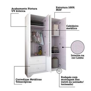 O Guarda Roupa de Bebê Ben Plus foi desenvolvido para oferecer qualidade, beleza, conforto e segurança para toda família na hora de montar o quartinho do(a) bebê. É produzido com estrutura em MDF e acabamento em pintura UV atóxica. Possui 4 portas, 2 gavetas que deslizam sob corrediças telescópicas, 1 cabideiro metálico que suporta até 5kg, 3 prateleiras para acomodar as peças com organização da sua preferência e puxadores em plástico. Acompanham o produto, 2 opções de rodapés, um usinado (torneado) e outro retrô, para que você escolha no momento da montagem qual se adequa ao estilo do ambiente. Aproveite para adquirir o seu agora!