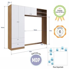 Marca: Completa Móveis | Modelo: Linha Infantil | Material: MDP | Acabamento: Fosco | Cor: Nogal Manchester com Branco | Largura (cm): 200 | Altura (cm): | Profundidade (cm): 40 | Peso do Produto (Kg): | Quantidade de Volume: 2 | Peso Suportado (Kg): 42 | Quantidade de Gavetas: 2 | Tipo da Corrediça: Metálica | Peso Suportado por Gaveta (Kg): 3 | Possui Chave: Não | Possui Puxador: Sim | Material do Puxador: Plástico | Quantidade de Portas: 4 | Material da Dobradiça: Metálica | Possui Prateleira: Sim | Tipo de Prateleira: Fixa | Peso Suportado por Prateleira (Kg): 8 | Possui Cabideiro: Sim | Material do Cabideiro: Madeira com Revestimento Plástico | Peso Suportado por Cabideiro (Kg): 5 | Possui Espelho: Não | Necessita Montagem: Sim | Nível de Dificuldade da Montagem: Médio | Sistema de Montagem: Parafusos + Cavilhas + Pregos + Minifix + Corrediças + Dobradiças | País de Origem: | Duração da Garantia: 6 meses | Tipo de Garantia: Garantia do Fabricante | Dimensão (A x L x C) cm: 184.5x40x200 | Quantidade de Item: 1 | Quantidade de Cabideiro: 1 | Peso Suportado por Nicho (Kg): 5 | Quantidade de Nichos: 3 | Tipo de Abertura das Portas: Giro | Inclui Manual de Montagem: Sim