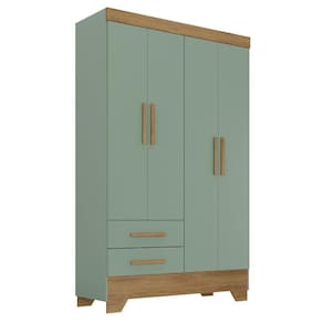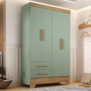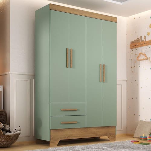 Guarda Roupa Infantil 4 Portas e 2 Gavetas Tic Tac Verde Fosco/Nature. Apresentamos um guarda-roupa da linha infantil que combina estilo e funcionalidade. Sua construção robusta inclui laterais, divisões, chapéus e prateleiras em MDP de 12mm, com rodapés, frente de gavetas, encabeçamento e portas em MDP de 15mm. O fundo do roupeiro e das gavetas é feito de MDF de 3mm. Detalhes como corrediças metálicas de 350mm e puxador em MDF, tornam-no atraente. O interior é bem organizado, incluindo um cabideiro de madeira revestida. A pintura UV fosca e o moderno padrão de cores internas acrescentam estilo. A montagem é simplificada com um manual detalhado, parafusos e cavilhas. Durante o transporte, é protegido com embalagem cuidadosa, incluindo medidas de segurança no topo e travamento das peças. Uma escolha prática e elegante para embelezar o quarto infantil Ean: 7896614978759