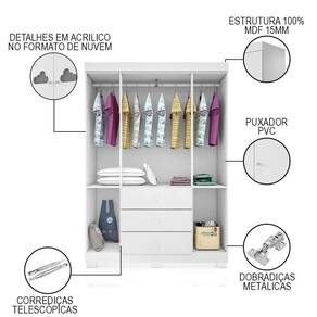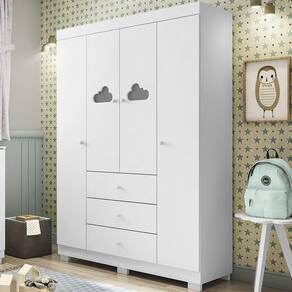 O Guarda Roupa Infantil é um dos móveis mais importantes do quarto de bebê, afinal ele será utilizado para guardar muitas coisas como roupinhas, sapatinhos, fraldas, lenços, toalhas e demais objetos. Pensando na otimização da sua rotina, apresentamos o Guarda Roupa Ane com design atemporal e clean, torna o ambiente apaixonante! O detalhe nas portas em acrílico no formato de nuvem, são um charme a parte. Este roupeiro conta com 4 portas, 3 gavetas com corrediças telescópicas, cabideiro metálico e amplo espaço interno.