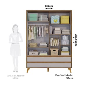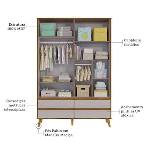 O Guarda-roupa é um produto 100% MDF e possui pintura atóxica. Os puxadores tipo cava são fabricados em MDF revestido. Possui cabideiro metálico, gavetas com corrediças telescópicas e portas com dobradiça slow motion.