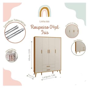 Procurando as principais tendências com o melhor preço? Apresentamos para você o Guarda Roupa Infantil 4 Portas Isis desenvolvido pela Reller com estrutura em MDF, design sofisticado, e amplo espaço interno com prateleiras, gavetas e cabideiro, perfeito para deixar as roupinhas, sapatinhos e acessórios do bebê organizados, aproveite!