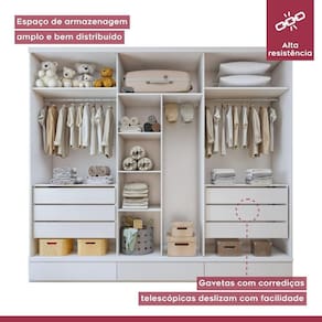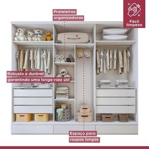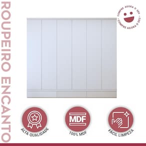 Nosso guarda roupa infantil é perfeito para guardar todas as roupinhas, brinquedos e acessórios dos pequenos com muito estilo e organização! Com um design moderno, o guarda roupa branco combina perfeitamente com qualquer decoração. Com várias portas e prateleiras espaçosas, é ideal para manter tudo arrumado e fácil de achar. Feito com materiais de alta qualidade, ele é super resistente e acompanhará o crescimento das crianças por muitos anos. Se você busca por um guarda-roupa infantil grande , que ofereça praticidade e fofura ao mesmo tempo, ele é a escolha ideal para a decoração para quarto infantil. É um guarda roupa grande? Sim, é um guarda roupa com 6 portas amplas. Como limpar um guarda roupa de MDF? Deve ser limpo com flanela limpa e seca.
