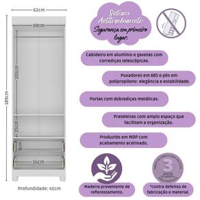Diferenciais: - 3 anos de garantia contra defeitos de fabricação e material. - Produzido em madeira de reflorestamento (MDP 12/15mm) com acabamento acetinado (cerca de 20% de brilho): sustentabilidade e durabilidade. - 2 portas e 2 gavetas: amplo espaço interno para organizar roupinhas e acessórios. - Corrediças telescópicas: permitem a abertura total e o manuseio silencioso das gavetas. - Cabideiro em alumínio: acomoda roupas longas e curtas para que não amassem. - Puxadores em ABS redondos e práticos. - Pés em polipropileno e rodapé: estabilidade e visual elegante. - Sistema antitombamento: proporciona segurança para o filho e tranquilidade aos pais.