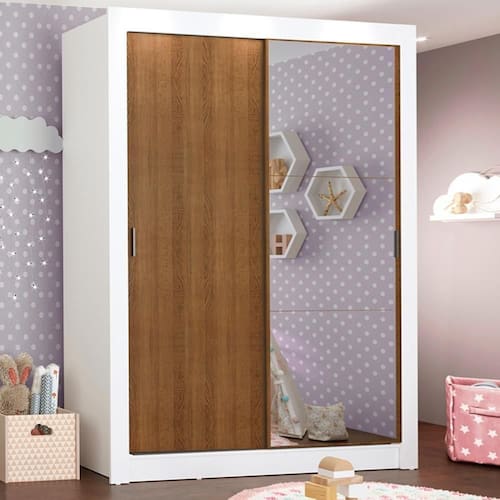 - Itens inclusos: Duas gavetas com corrediças metálicas | Um cabideiro metálico grande | Duas prateleiras | Quatro nichos | Duas portas de correr, uma de madeira e uma com espelhos, ambas com puxadores em PVC