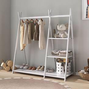 O Guarda Roupa Infantil Branco Arara Madeira Montessori Lotte foi pensado para estimular a independência desde cedo. Com estrutura em madeira maciça e design montessoriano, traz barra para cabides na altura da criança e prateleiras laterais perfeitas para brinquedos, sapatos ou acessórios. Funcional e encantador, ele é ideal para manter tudo em ordem de forma acessível, prática e cheia de charme.