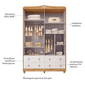 O Guarda-Roupa Infantil Elô 4 Portas e 4 Gavetas combina funcionalidade e delicadeza para o quarto das crianças. Com estrutura em MDF e pintura UV atóxica, conta com 4 portas, possui cabideiro metálico, prateleiras bem distribuídas e 4 gavetas com corrediças telescópicas que suportam até 4kg cada. Os puxadores pontuais em plástico e os pés no mesmo material garantem praticidade no uso diário. Um guarda-roupa espaçoso e eficiente para manter tudo organizado com estilo.