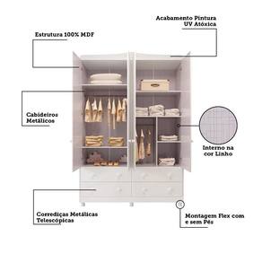 O Guarda-Roupa Infantil Elô 4 Portas e 4 Gavetas combina funcionalidade e delicadeza para o quarto das crianças. Com estrutura em MDF e pintura UV atóxica, conta com 4 portas, possui cabideiro metálico, prateleiras bem distribuídas e 4 gavetas com corrediças telescópicas que suportam até 4kg cada. Os puxadores pontuais em plástico e os pés no mesmo material garantem praticidade no uso diário. Um guarda-roupa espaçoso e eficiente para manter tudo organizado com estilo.