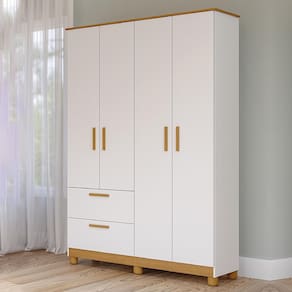 Guarda Roupa Infantil Jujuba 4 Portas e 2 Gavetas - Permóbili Baby O Guarda Roupa Infantil Jujuba 4 Portas é o sonho de qualquer criança e dos pais que buscam qualidade e praticidade. Sua estrutura em MDF com pintura UV garante resistência e um visual encantador para o quarto dos pequenos. Com quatro portas e duas gavetas, oferece amplo espaço para organizar roupas, brinquedos e acessórios. As dobradiças metálicas e corrediças telescópicas garantem durabilidade e suavidade no abrir e fechar. Além disso, possui cabideiro, prateleiras internas e puxadores em ABS, detalhes que agregam funcionalidade e charme ao móvel. Com capacidade para até 3kg em cada gaveta, é a escolha ideal para completar o quarto dos pequenos com conforto e elegância.