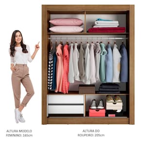 Medidas totais do guarda-roupa: 205 cm de altura x 117 cm de largura x 46 cm de profundidade.