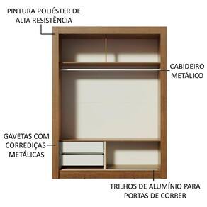 Possui duas portas de correr de deslizamento suave, trilhos em alumínio, dobradiças metálicas e ferragens de qualidade que proporcionam melhor sustentação ao móvel. Contempla duas gavetas com corrediças metálicas, duas prateleiras e três nichos, além de um cabideiro de metal resistente e de tamanho diferenciado, 105 cm.