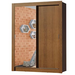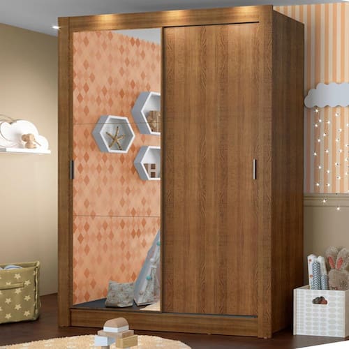 Itens inclusos: - Um (1) cabideiro metálico grande - Duas (2) prateleiras e quatro (4) nichos - Duas (2) portas de correr, sendo uma (1) de madeira e uma (1) com espelhos, ambas com puxadores em PVC