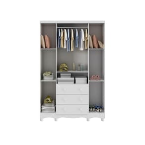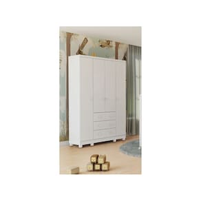 O Armário Júnior New 4 Portas é um produto 100% MDF e possui pintura atóxica. Sua estrutura é fabricada em chapa de 12 mm e seus pés são injetados em plástico de alta resistência. Os puxadores são também em plástico. Os cabideiros são metálicos e suas gavetas possuem corrediças apoiadas metálicas. Acompanha dois modelos de rodapés que podem ser definidos no momento da montagem.