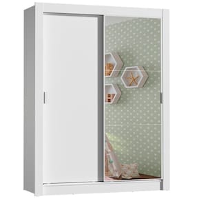 - Itens inclusos: Quatro gavetas com corrediças metálicas | Um cabideiro metálico grande | Duas prateleiras | Três nichos | Duas portas de correr uma de madeira e outra com espelho, ambas com puxadores em PVC