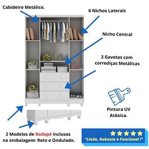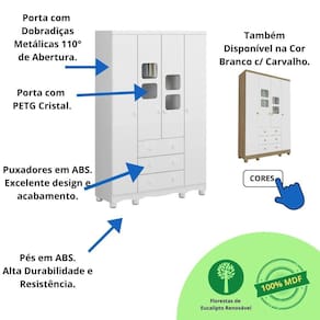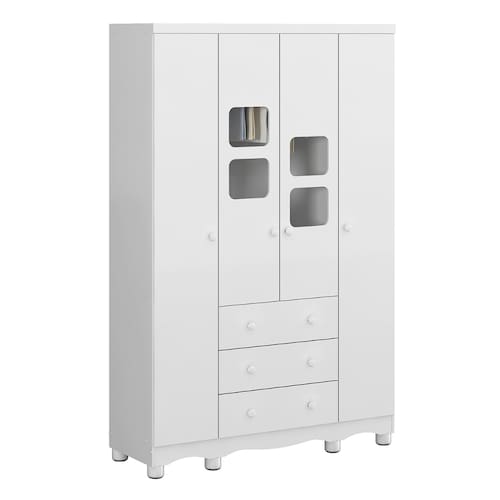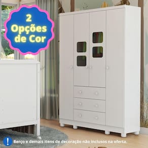 O Armário Uli 04 portas é um produto 100% MDF, sua pintura é atoxica, possui cabideiro metálico, puxadores plásticos, corrediças metálicas, pé plástico, 02 modelos de rodapé incluso e portas com PETG cristal.