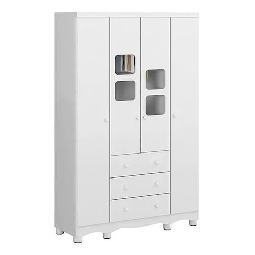 ESPECIFICAÇÕES: Estrutura em MDF Pintura UV atóxica 4 Portas Dobradiças metálicas Portas centrais com janela PETG Cristal/Acrílico Cabideiro metálico Prateleiras 3 Gavetas Corrediças telescópicas Suporta até 4Kg em cada gaveta Puxadores pontuais em plástico 2 Opções de rodapés: um usinado (torneado) e outro reto Pés em plástico Amplo espaço interno