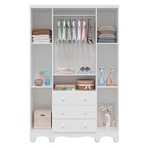 Guarda Roupa Infantil Uli New 4 Portas e 3 Gavetas - Móveis Peroba O Guarda-Roupa Infantil Uli New 3 Portas e 3 Gavetas é ideal para manter o quarto do bebê sempre organizado com charme e praticidade. Com estrutura em MDF e pintura UV atóxica, oferece segurança e durabilidade. Possui 4 portas sendo que 2 delas contam com janelas em PETG Cristal/Acrílico, que adicionam um toque delicado ao design. Internamente, possui cabideiro metálico e prateleiras para otimizar a organização das roupinhas. As 3 gavetas com corrediças telescópicas suportam até 4kg cada. Os puxadores pontuais em plástico e os pés em plástico completam o visual funcional. Acompanha 2 opções de rodapés: um usinado (torneado) e outro reto para personalizar conforme o estilo do ambiente.
