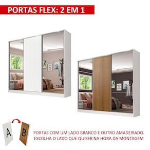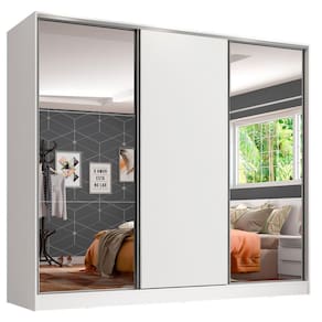 - Itens inclusos: Quatro (4) gavetas internas | Oito (8) prateleiras | Três (3) cabideiros | Três (3) portas de correr, sendo uma (1) de madeira e duas (2) com espelhos, com sistema anti-descarrilhamento