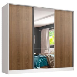 Itens inclusos: - Quatro (4) gavetas internas - Oito (8) prateleiras - Três (3) cabideiros - Três (3) portas de correr, sendo duas (2) de madeira e uma (1) com espelhos