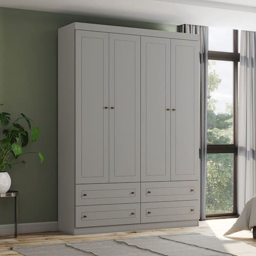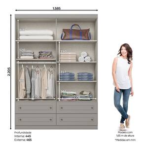 Produto inspirado na decoração minimalista, aconchegante e encantador, capaz de adequar o tradicional com o contemporâneo, excelente para modernizar seu ambiente, podendo ser utilizado para quartos adulto, juvenil e infantil. Possui medidas de 2.205mm de altura, 1.585mm de largura e 465mm de profundidade. Tanto nas portas quantas nas gavetas possuem desenhos de usinagem em baixo relevo, gavetas com corrediças telescópicas asseguram um fechamento suave e maior abertura das gavetas, puxadores ABS na cor bronze. Roupeiro elegante e sofisticado excelente para compor seu ambiente e proporcionando sutileza ao espaço.! Acabamento da Prateleira: Pintura Texturizada UV Escala de Brilho da Prateleira: Fosco Possui Cabideiros: Sim Acabamento da Gaveta: Pintura Texturizada UV Escala de Brilho da Gaveta: Fosco Material do Puxador da Gaveta: Metal Possui Organizador de Gaveta: Não Acabamento da Porta: Pintura Texturizada UV Escala de Brilho da Porta: Fosco Ambiente Principal: Quarto Infantil codigo_ean: 7900288073365 Complexidade da Montagem: Alta: deve ser montado por um montador especializado Cor: Cinza Cor da Porta: Branco Cor do Produto: Cinza Cor Interna: Trama Escala de Brilho: Fosco Espessura da Estrutura (mm): 15 mm Espessura das Portas (mm): 15 mm Espessura das Prateleiras (mm): 15 mm Espessura do Fundo (mm): 3 mm Espessura do Fundo das Gavetas (mm): 3 mm Itens Inclusos: 1 Guarda Roupa e 1 Manual de Montagem Linha ou Coleção: Americano Manual de Montagem e Instalação: https://product-hub-prd.madeiramadeira.com.br/979262/documents/d3679e83-3b48-4af3-915d-83d19c731aa53roupeiroamericano04portas.pdf Marca: Henn Material da Gaveta: MDP Material da Porta: MDF Material da Prateleira: MDP Material Principal: MDF/MDP modular: Não Necessita Montagem: Sim Origem do Produto: Nacional Peso: 111 kg Peso Máximo por Gaveta: 3 kg Peso Máximo por Prateleira: 8 kg Possui Calceiros: Não Possui Espelho: Não Possui Pés: Não Possui Portas: Sim Possui Prateleiras: Sim Produto Montado: Sim Quantidade de Cabideiros: 01 Cabideiro Quantidade de Gavetas: 04 Gavetas Quantidade de Prateleiras: 04 Prateleiras Recomendações de Uso, Manutenção e Limpeza: Para limpeza de seu móvel, use uma flanela seca ou umedecida. Não utilize produtos químicos que possam danificar o produto. Sistema de Montagem: Parafusos e Cavilhas Suporta Até (kg): 68 kg Tipo de Corrediça da Gaveta: Metálica Telescópica Tipo de Dobradiça/Corrediça da Porta: Telescópica Tipo de Gaveta: Externa Tipo de Guarda-Roupa: Infantil Tipo de Puxador da Gaveta: Externo Tipo de Puxador da Porta: Externo
