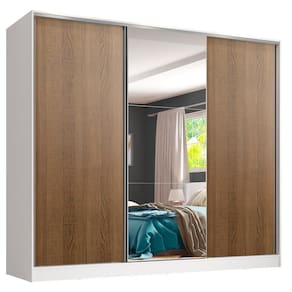- Itens inclusos: Quatro (4) gavetas internas | Oito (8) prateleiras | Três (3) cabideiros | Três (3) portas de correr, sendo duas (2) de madeira e uma (1) com espelhos
