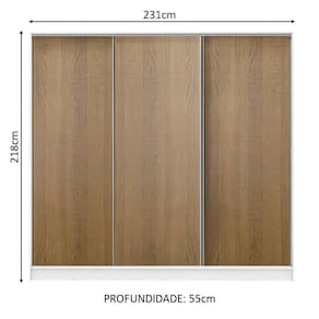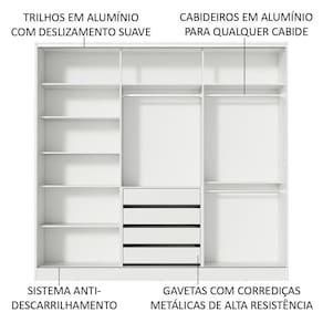 - Itens inclusos: Quatro (4) gavetas internas | Oito (8) prateleiras | Três (3) cabideiros | Três (3) portas de correr com sistema anti-descarrilhamento